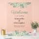 This elegant acrylic wedding welcome sign features a beautiful border of lush greenery, eucalyptus and light green flowers across the top and bottom. Personalize with the names of the bride and groom, their wedding date, and a personal thank you message.