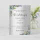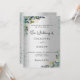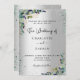 Faux silver looking background decorated with eucalyptus greenery, golden foliage and silver and green faux glitter, sparkles. Personalize and add your names and wedding details. Black letters.