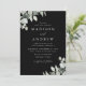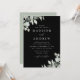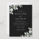 Elegant eucalyptus wedding invitations featuring your details at the centre of the design with bouquets of eucalyptus at the corners in shades of light and dark sage green with a black background. The watercolor eucalyptus wedding invites reverse to display a solid sage green background.