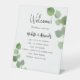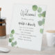 A modern, elegant, wedding program, timeline.  White background, decorated with eucalyptus greenery, sprigs. Personalize and add your names and wedding details. Black coloured letters.  If you have more text it's possible to reduce the line space.
