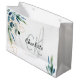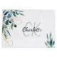 A chic white background. Decorated with watercolored eucalyptus greenery, and golden foliage. Personalize and add a name. The name is written with a modern hand lettered style script.