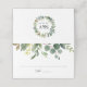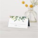 Chic botanical place card or table card design features a top border of green watercolor eucalyptus foliage. Space provided for guest name and table number. Cards reverse to reveal a matching botanical wreath with your initials and wedding date inside. Designed to match our Eucalyptus Grove wedding and event collection.