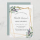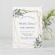 A stylish white background on the front. Decorated with eucalyptus and lavender florals. A faux gold geometric frame. Personalize and add a name and details.