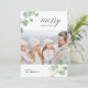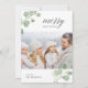 Partagez vos voeux de vacances avec ces cartes photo de Noël chic avec votre photo horizontale ou paysagère préférée encadrée en haut et en bas par des feuilles d'eucalyptus aquarellés en vert pastel. "Joyeux Noël" apparaît en haut à droite dans un élégant mélange de calligraphie et de lettres modernes. Personnalisez avec votre salutation/signature personnalisée et les noms en bas à gauche.
