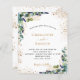 A white background decorated with eucalyptus greenery and golden foliage. Personalize and add your names and wedding details. Black and golden coloured letters.