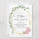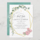 Trendy geometric eucalyptus greenery and blush pink roses baptism, christening or dedication invitation with gold geometric frame and mint watercolor wash reverse.