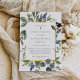 Chic botanical invitation for baptisms, christenings, or baby dedications features a border of lush sage green botanical leaves and watercolor eucalyptus foliage with gold foil trim. Personalize with your ceremony and party details in modern lettering on a crisp white and soft ivory background.