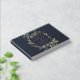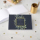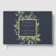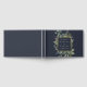 Our Eucalyptus & Sage wedding guestbook frames your names and wedding date with an elegant square border of lush watercolor eucalyptus and sage green leaves, with luxe gold foil trim against a rich navy blue background.