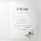 Elegant eucalyptus foliage geometric all-in-one wedding tri-fold photo invitation card you can customize with your wedding details by clicking the "Personalize" button. Features modern popular typography with script text in black on white background