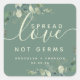 This modern design says spread love not germs in trendy script typography surrounded by eucalyptus leaves. Personalize with your names and wedding date.