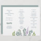 Modèle du programme de mariage plié Eucalyptus. Plier comme un accordéon à utiliser pour la cérémonie. Un petit jet de feuilles gris-bleu décore l'avant (panneau gauche) juste sous les noms du couple. Davantage de verdure et un brin de lavande "grandissent" du fond du papier blanc. L'inverse est de couleur gris-bleu uni.