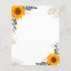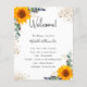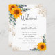A modern, elegant, wedding program, timeline. A chic white background. Decorated with sunflowers, green watercolored eucalyptus leaves, sprigs, greenery, faux gold leaves and golden glitter spots. Personalize and add your names and wedding details. Black coloured letters. If you have more text it's possible to reduce the line space.