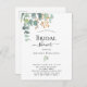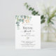 Un arrière - plan blanc chic. Décoré de feuilles d'eucalyptus verts aquarellés, de sprigs, de verdure et d'une fausse feuille d'or. Personnalisez et le nom de la mariée à être et les détails du parti. Lettres noires. Retour : conception de carte postale. Conseil : Si vous ne voulez pas qu'il ressemble à une carte postale, cliquez sur customiser, allez à l'arrière et retirez le séparateur et le timbre postal.