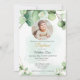 Ce beau baptême ou cette invitation à baptiser présente un arrière - plan naturel avec eucalyptus vert et une croix d'or au centre. Le dos de la carte est vert eucalyptus.