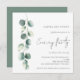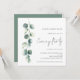Sage Eucalyptus Wedding Evening Party Square Invitation. Available digitally and printed. A Minimalist botanical style to invite your evening wedding guests. A set handwritten script for Evening Party and the rest of the text you can easily personalize. An elegant branch of watercolor eucalyptus leaves runs down the left hand side.