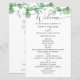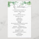 Create a polished ceremony experience with this double-sided wedding program featuring soft watercolor eucalyptus greenery across the top for a fresh, modern botanical look. Front side: a warm Welcome header with a clean order of ceremony layout (processional, readings, vows, rings, unity candle, recessional, and more). Back side: a dedicated Wedding Party section to list parents, officiant, maid of honor, bridesmaids, best man, groomsmen, flower girl, ring bearer, and any special roles. This design pairs elegant script with classic typography. Perfect for greenery, outdoor, garden, botanical, and modern classic weddings.