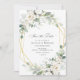 greenery wedding theme with eucalyptus foliage, white watercolor flowers and a gold frame. The text and colours can be edited.