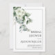 This bridal shower invitation showcases eucalyptus branches on the upper left corner with delicate white flowers and a thin black border. The text on the invitation is presented in ecorative typography. The black thin border of the invitation complements the floral theme perfectly, creating a cohesive and visually appealing look for the event.