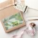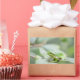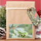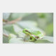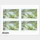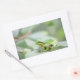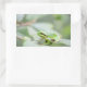 Rectangular photo sticker of a green european tree frog, hyla arborea, sitting on leaves creating a green background. Taken in the Netherlands.