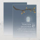 An outdoors fall autumn evening wedding invitation featuring an illustration of a mason jar with candle inside hanging from a tree branch with orange and brown leaves. Personalize the text with your information.
