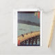 This Japanese colour print was created by Ichiyusai Hiroshige in the 19th Century. The full name of the print is: "Evening Shower at Atake and the Great Bridge". This Japanese print is from the famous series: One Hundred Famous Views of Edo" (Meisho Yedo Hiakkei). In it we see a few Japanese workers crossing a large bridge, while a storm is raging, and a lot of rain is falling. They're covering themselves with straw hats, coats and perhaps umbrellas. In the background we also see a Japanese sailor on a canoe like boat crossing the river. The sky is quite dark because of the storm, and it's too dark to see the forests behind. The artist has also signed this artwork in Kanji characters and Hiragana (Japanese writing).