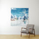 Evening village winter landscape with snow covered houses,snowman and mountains. Christmas holidays illustration