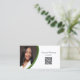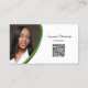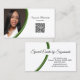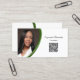 A green border sets off the photo on this business card design featuring a photo placeholder on the left with template name, title and QR code on the right. The back includes a colour coordinated design with text fields for the business name and details. Replace the placeholder photo with your vertical format photograph and your QR code on the front. Fill in the template fields, remove text or click customize to select a font style, size, and colour you like. Use your QR code to send customers to a website, reviews page, photos or other special page. The placeholder photo is courtesy pixabay.com.