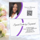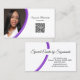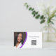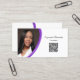 A purple border sets off the photo on this business card design featuring a photo placeholder on the left with template name, title and QR code on the right. The back includes a colour coordinated design with text fields for the business name and details. Replace the placeholder photo with your vertical format photograph and your link for the QR code on the front. Fill in the template fields, remove text or click customize to select a font style, size, and colour you like. Use your QR code to send customers to a website, reviews page, photos or other special page. The placeholder photo is courtesy pixabay.com.