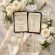 Celebrate your special day with this elegant Art Deco inspired wedding ceremony program fan. Featuring a sophisticated black and cream color palette and a classic Art Deco font, this fan is designed to impress your guests while keeping them cool. The 'Welcome' title is prominently displayed, followed by the names of the happy couple and the date and location of your wedding. Below, the 'The Ceremony' section details the order of events, including prelude, seating of parents, processional, entrance of the bride, readings, exchange of vows, and recessional. This beautiful fan serves as both a practical favor and a cherished keepsake for your guests, adding a touch of vintage glamour to your wedding.