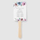 Élégant programme de mariage floral éventail main avec vos noms encadrés par des bouquets de fleurs violet, mauve et bleu aquarelle et feuilles verts. Personnalisez les fans du programme de mariage floral en ajoutant la date et l'emplacement de votre mariage, l'ordre des événements et la fête de mariage au dos. Conçu pour coordonner avec notre collection de mariages Midnight Blooms.