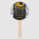 Élégante cérémonie de mariage campagnard rustique programme rond ventilateur modèle avec de beaux bouquets de tournesols jaune vif orangé, bordures de dentelle blanche et cordes de lumières chaudes sur un arrière - plan de bois foncé. ++++++++++++++++++++++++++++++++++++++++++++++++++++++++++++++++++++ | ferme | cottage jardin d'été | automne automne mariages extérieurs.
