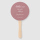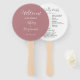 Programme de jour de mariage imprimé sur un ventilateur à main de style rond qui présente un arrière - plan de couleur rose tendance et poussiéreux sur le côté avant avec les noms de mariée et de mariée en blanc, stylisé. Le verso du programme répertorie les participants à la fête de mariage et les rites de cérémonie sur un arrière - plan blanc avec des lettres gris foncé. Modifiez le ventilateur de main et remplacez les informations du programme de mariage par les vôtres. Parfait pour une cérémonie de mariage à l'intérieur ou à l'extérieur ! Sélectionnez le nombre de programmes de ventilateur à main désiré.