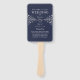 Élégante calligraphie simple et moderne marine programme de mariage bleu mains ventilateurs avec coeur de corde argent et dentelle dorée fleurie.