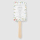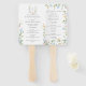 The front displays your ceremony details beneath a coordinating floral monogram crest, while the back features the full wedding party lineup framed by matching blooms for a beautifully cohesive presentation. Designed as a handheld fan with a wooden handle, it’s perfect for outdoor ceremonies, summer weddings, garden venues, and warm-weather celebrations.