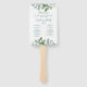 Ce ventilateur de programme avec de l'eucaluptus vert sauge est un excellent moyen d'accueillir vos invités et de les garder cool par temps chaud. Le côté avant les remercie d'être venus. L'autre côté montre les détails de votre cérémonie et de votre fête de mariage. Tous les champs peuvent être customisés à vos spécifications