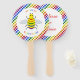 Ce fantastique ventilateur mariage à main présente une image graphique en arc-en-ciel d'une abeille. L'abeille a un corps jaune avec yeux noirs, jambes et antennes et 5 bandes sur son ventre, une en rouge, orange, vert, bleu et violet. Il y a un texte en arc-en-ciel autour de l'abeille qui dit "Abee fière abeille qui tu es" Il y a aussi une sélection de fleurs en arc-en-ciel dans l'arrière - plan. Il y a du texte personnalisé à l'arrière pour inclure le nom du couple heureux.