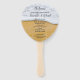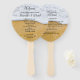 Programme de ventilateur double face pour mariage sur la plage. Plage dorée sable et surf blanc image est l'arrière - plan pour la calligraphie noire texte imprimé avec des modèles de chaque côté. Achetez comme un kit qui vient avec des bâtons et des points de colle et assemblez-vous, ou payez un supplément pour les recevoir déjà fait.