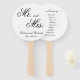 Programme de mariage élégant Ventilateur à la main avec les mots "M. et Mme" ainsi que vos noms et date mariage dans une belle calligraphie noire sur un arrière - plan blanc sur le côté avant. La partie arrière organise des cérémonies. Ces élégants ventilateurs à main Mariages sauront vous fournir la commande de service et sont parfaits pour un mariage extérieur de cravate noire ou réception.