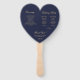 Un ventilateur simple mais élégant en forme de coeur de programme de mariage pour un thème marine et mariage d'or. Les titres et les noms (et les initiales) de la mariée et du marié sont écrits dans un élégant script calligraphique, le reste en casquette. L'arrière - plan est bleu marine, le texte est jaune doré. A l'arrière, il a sur le côté gauche le programme de cérémonie mariage et, sur le côté droit, la fête de mariage (avec 2 colonnes différentes pour l'équipe mariée et l'équipe mariée). et sous eux un court message Merci.