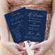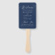Cet élégant éventail de main programme de mariage présente une gracieuse calligraphie blanche sur un riche arrière - plan de la marine, ce qui en fait un ajout étonnant à votre jour de mariage. Personnalisez le ventilateur avec vos noms, la date du mariage, l'emplacement et un message de remerciement sincère en caractères gras et blancs. L'envers offre un grand espace pour les détails de votre cérémonie et les noms de votre fête de mariage, ajoutant une touche personnelle pour vos invités. Avec son design moderne, simple et élégant, ce ventilateur de programme est parfait pour les mariages formels et décontractés en toute saison. Non seulement il gardera vos invités cool, mais il sert aussi de beau gardien de votre journée spéciale.
