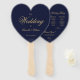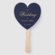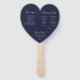 Un éventail simple mais élégant en forme de cœur pour un mariage sur le thème de la marine et de l'or. Les titres et les noms (ainsi que les initiales) de la mariée et du marié sont écrits dans une belle écriture calligraphique, le reste en majuscules. Le fond est bleu marine, le texte est jaune doré. Au dos, il y a à gauche le programme de la cérémonie de mariage et, à droite, le cortège de mariage (avec 2 colonnes différentes pour l'équipe de la mariée et celle du marié), et en dessous un court message de remerciement.