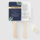 Éventails de programme de mariage modernes, élégants, botaniques or et bleu marine, avec feuillage aquarelle et écriture calligraphique simple.