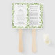 Éventail de main de programme de mariage rustique avec vos détails entourés de feuilles d'olive. Vos détails sont dans une police gris moyen. Le devant comporte vos événements de cérémonie et le dos comporte votre cortège de mariage. Les éventails à main sont parfaits pour un mariage en plein air en été.