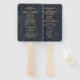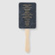 Programme de cérémonie de mariage/ordre de service éventails à main dans un beau et élégant bleu marine avec texte doré. Ils comprennent le programme de la cérémonie ainsi que les noms des parents de la mariée et du marié, l'officiant, le cortège nuptial et les autres participants. Contactez-nous pour obtenir de l'aide sur la personnalisation ou les produits correspondants.