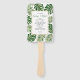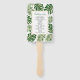 Ventilateur de mariée feuille tropicale verte et dorée. Il présente des feuilles de Fromage Leaf Philodendron (Monstera deliciosa) ou de Fromage Suisse Plante et feuilles de palme en vert avec contour d'or. Votre libellé est dans un cadre blanc avec contour doré.