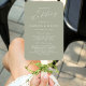 Cet élégant éventail de programmes de mariage moderne présente du texte blanc sur un arrière - plan vert sage. Les titres et sous-titres apparaissent dans un magnifique script de calligraphie, avec les noms du couple en serif et le reste du texte en sans serif police.