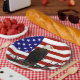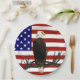 A Bald Eagle scans the sky from his perch on a tree branch; superimposed on a flag of the United States.