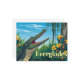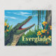Dramatic vintage-style travel poster illustration featuring a large American alligator with its mouth wide open, surrounded by green sawgrass, cypress, and yellow swamp flowers, labeled "Everglades National Park." Captures the iconic wildlife and wetland ecosystem of the Florida park. Ideal for wildlife enthusiasts, Florida travelers, and fans of bold, retro nature art.
