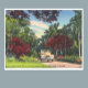 Vintage Florida Everglades poster taken from an antique postcard titled "Palm lined drive in Everglades National Park, Florida" showing native plants and trees and a vintage automobile. Possibly rom around the 1940s.
