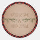 An outdoors evening wedding sticker featuring an illustration of two evergreen tree branches. Background is red and black plaid. Personalize the text with your names.